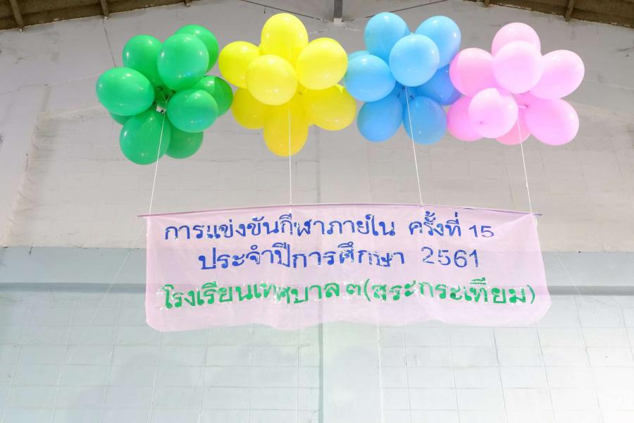 ท่านผู้อำนวยการธงชัย นนทสีเป็นประธานเปิดงานแข่งขันกีฬาภายใน ครั้งที่ 15 ประจำปีการศึกษา 2561 โรงเรียนเทศบาล๓(สระกระเทียม) ในวันที่ 7-8 กุมภาพันธ์ 2562 ณ โรงยิมเอนกประสงค์โรงเรียนเทศบาล๓(สระกระเทียม) ## งานประชาสัมพันธ์โรงเรียนเทศบาล3 ## S:0